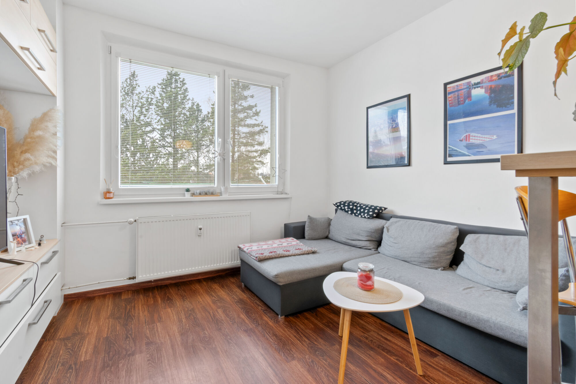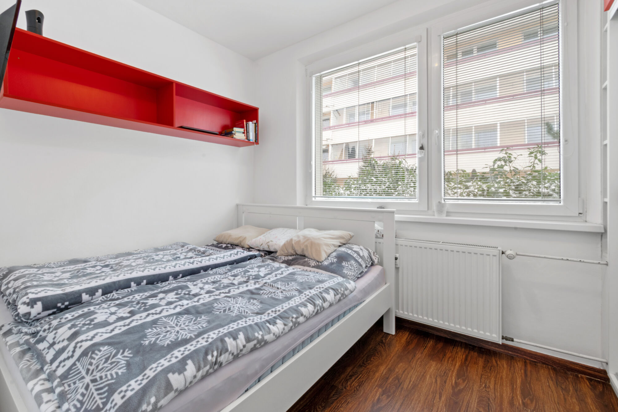 Vchod k bytu je z přízemí bytového domu v klidném vnitrobloku, pokoj je ve výši 1. patra. Orientace je na východ (ložnice) a na západ (obývací pokoj). K bytu patří sklep.